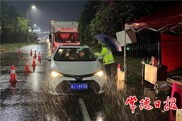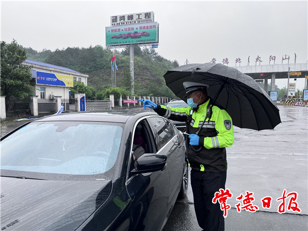 “您好,請戴好口罩,在前方防疫健康服務點掃場所碼,接受相關檢測?!?月15日13時許,雨漸下漸大,市公安交警柳葉湖大隊民輔警堅守常德東北(柳葉湖)高速口,對下高速的每一臺車輛司乘人員進行疫情排查。