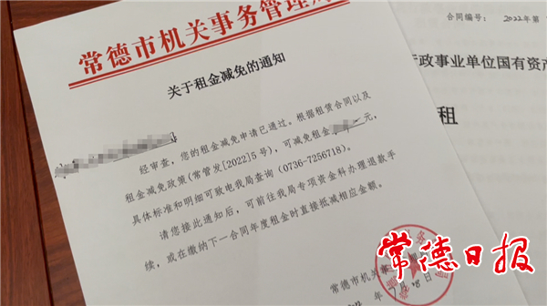 “您好,您的門面租金減免申請已通過,這是您的減免通知書?!?月29日上午10時,常德市機關(guān)事務(wù)管理局機關(guān)黨支部的黨員志愿者們來到位于濱湖路和武陵大道路交叉口附近的一家快餐店,將租金減免通知書送到店主張超手中。