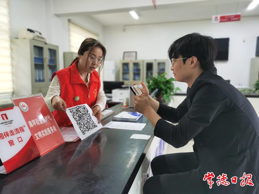 在武陵區(qū)南坪街道便民服務(wù)大廳,該街道工作人員正引導(dǎo)辦事市民下載“湘易辦”,讓居民諸事易辦