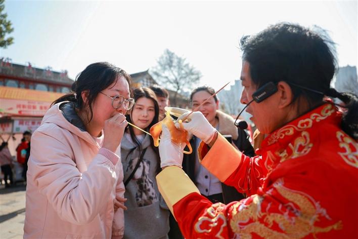 1月28日,常德河街,市民游客在吹糖人的幫助下收獲了一個“自己吹出來的”糖人。本報記者 蔡文龍 攝