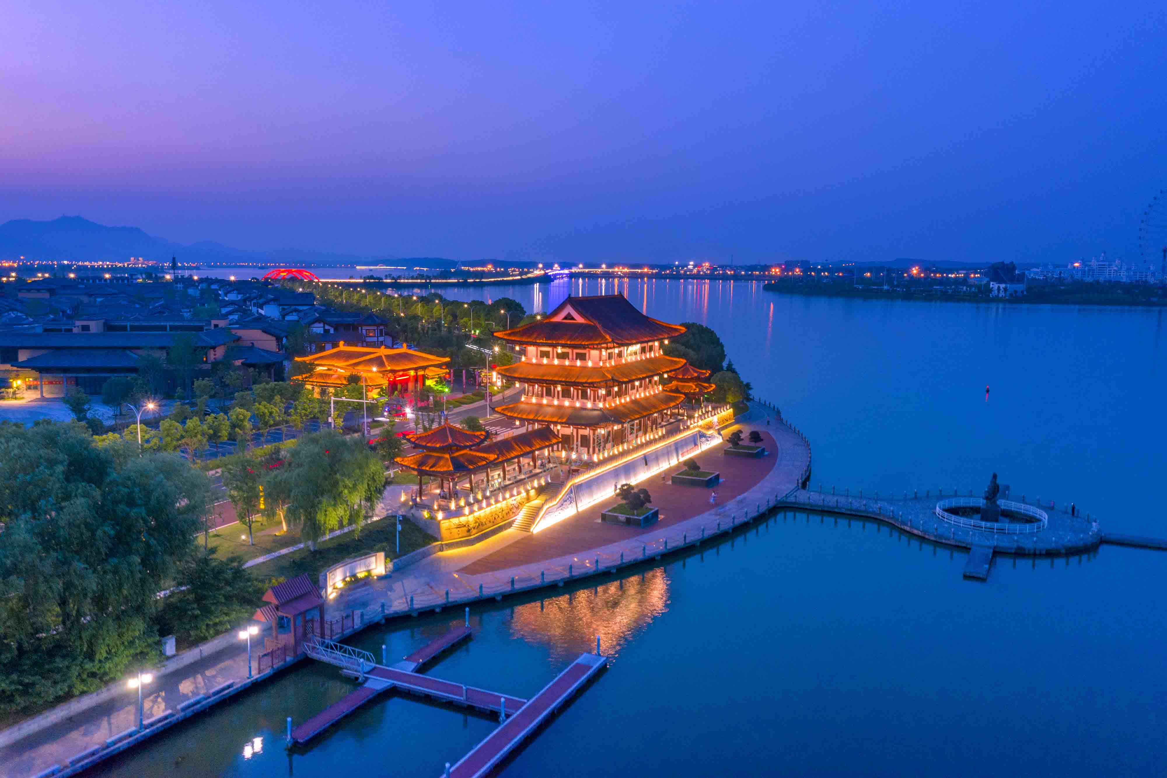 司馬樓是為紀(jì)念唐代“詩豪”朗州司馬劉禹錫而建,由主樓、觀景平臺、連廊亭閣三部分組成,主樓外觀為三層仿唐式建筑,內(nèi)部設(shè)多功能展廳,陳列多篇劉禹錫的懷古詠史之作,是景區(qū)環(huán)湖路上的文旅地標(biāo)建筑。觀景平臺面積達(dá)1200平方米,逼真的劉禹錫銅像屹立其間,宏偉壯觀,與主樓交相輝映。銅像邊的兩只白鶴,一只低頭沉思,一只展翅欲飛。可以想象,劉禹錫當(dāng)年在這里或臨湖而立,誦千古名篇;或登樓憑欄,瞰柳葉湖景。2022年司馬樓打造成柳葉湖清廉文化教育基地。
