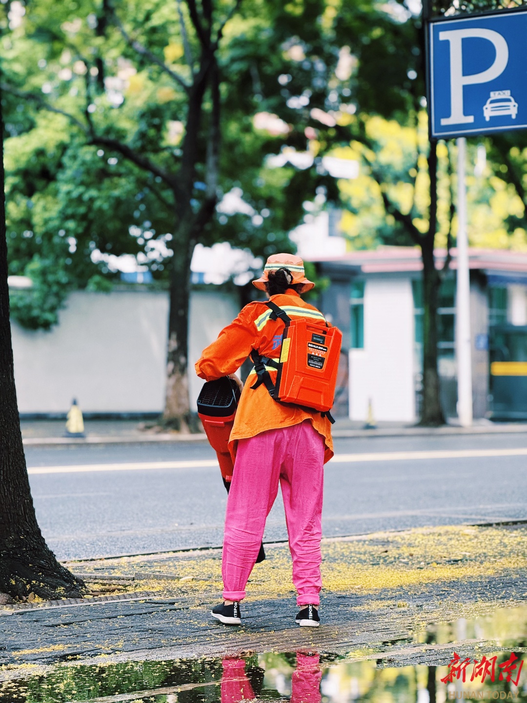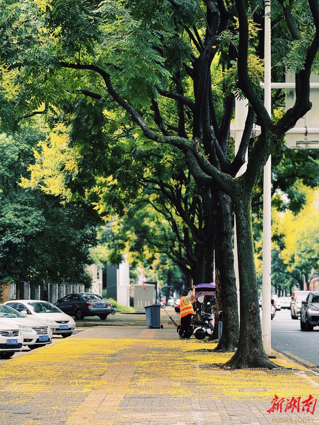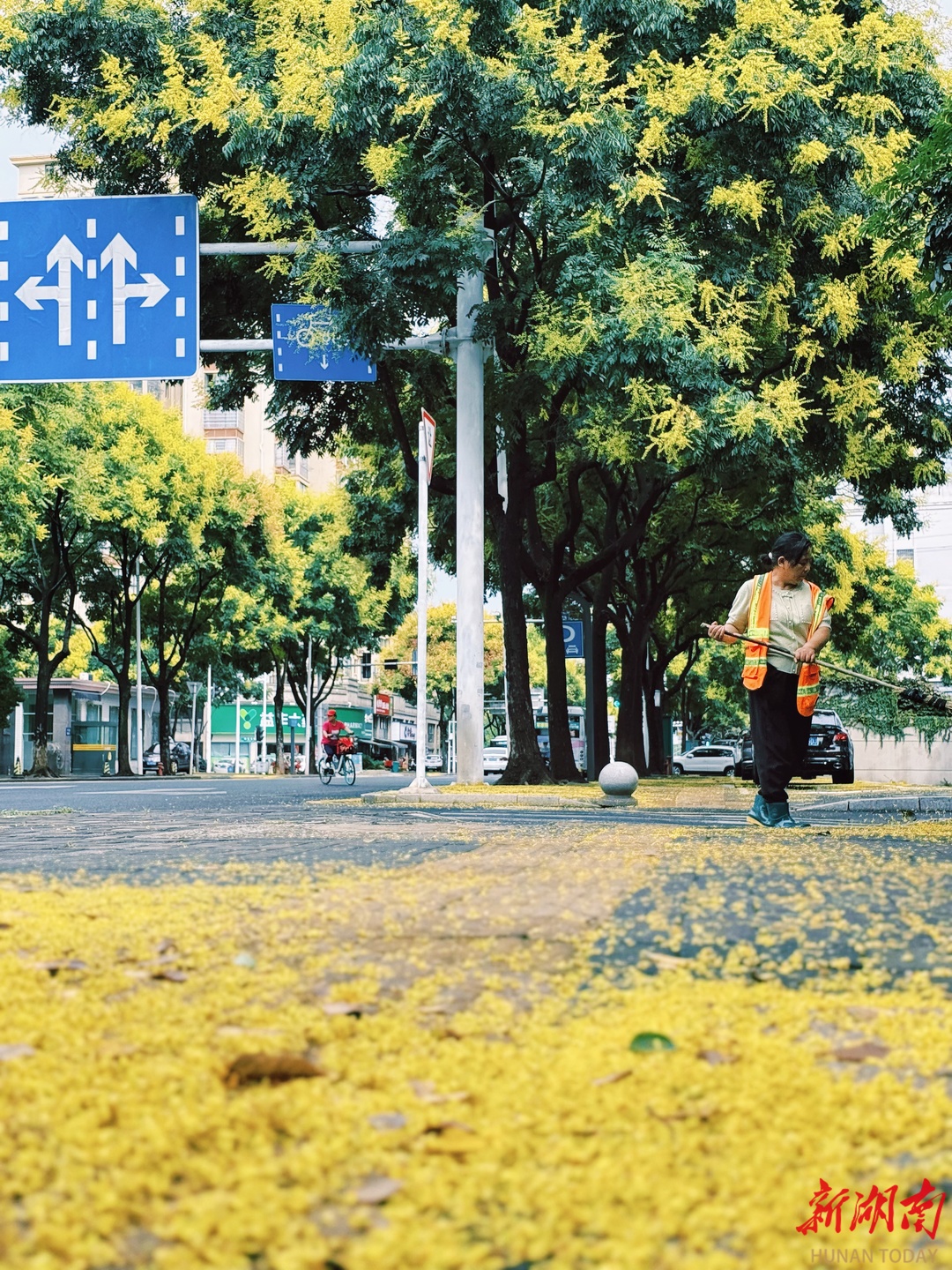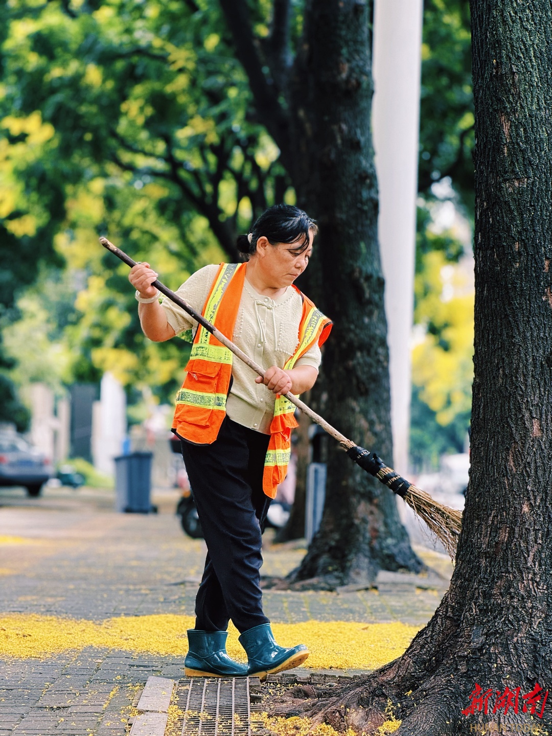 有一群身影格外動人——身著橙黃工裝的環(huán)衛(wèi)工人,她們正握著掃帚輕輕清掃這一地金黃。不疾不徐,怕驚擾了這份秋日浪漫,將散落的欒樹花歸攏成小堆,既護了街道的整潔,也留了枝頭的明媚。