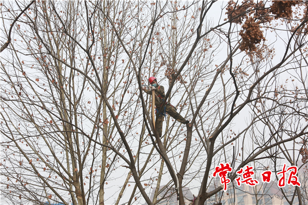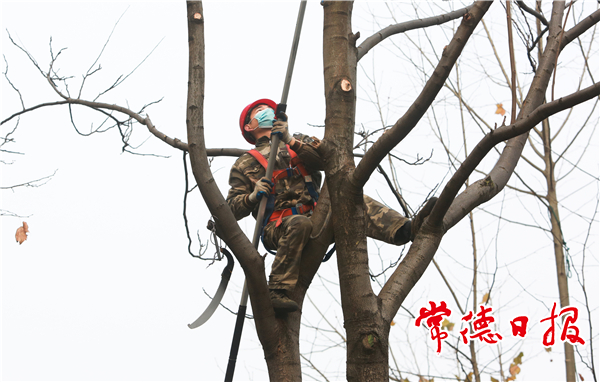 1月18日上午,常德市城區(qū)紫緣路柳葉大道附近,輔路封閉,一群年輕工人正掛著安全繩,站在八米多高的樹干上,利用連接長桿的鋸子修剪樹枝。