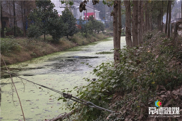 飄滿(mǎn)浮萍的溝渠,護(hù)坡上長(zhǎng)滿(mǎn)雜草
