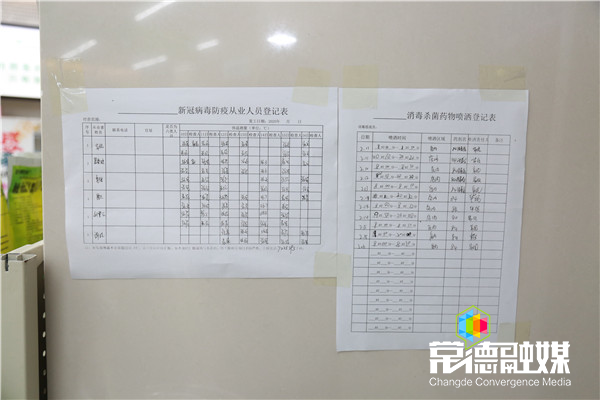 藥店墻上張貼的人員體溫檢測(cè)表和定時(shí)消毒登記表