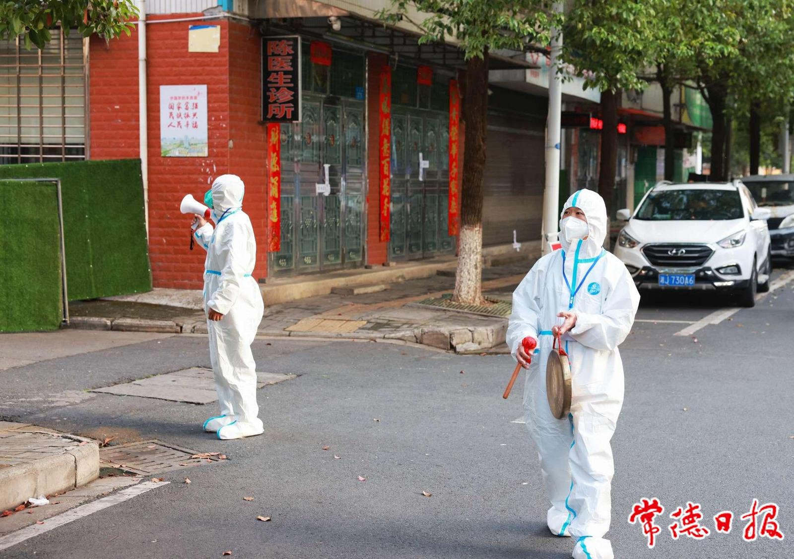 防疫人員用敲鑼宣傳的方式提醒高風(fēng)險區(qū)群眾居家不出門