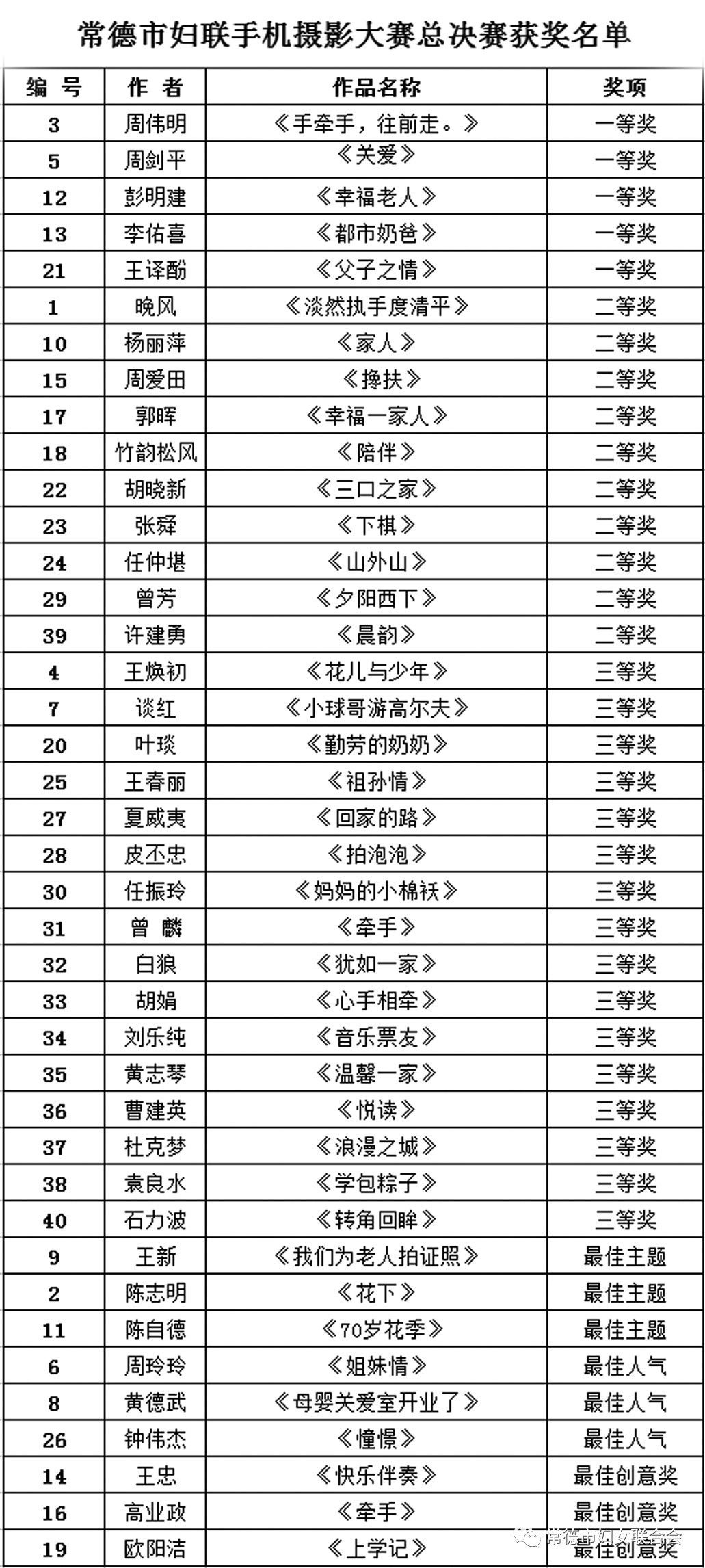 由常德市婦聯(lián)舉辦的“親親常德?幸福家庭"手機攝影大賽自啟動以來,收到了朋友們的踴躍來稿,為我們呈現(xiàn)了很多溫暖的瞬間。按照評選原則,每位入圍者只能有一幅作品獲獎,我們從200名作品中,最終評選出了40名幅優(yōu)秀作品作為最終獲獎作品,并評選出一、二、三等獎、最佳主題獎、最佳人氣獎、最佳創(chuàng)意獎,先將公示如下: