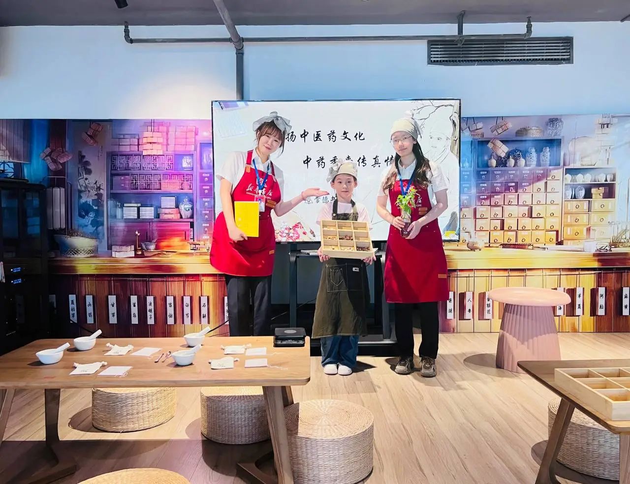 店員老師通過(guò)演示選取藥材、搗碎、稱(chēng)重、裝粉等流程,手把手教學(xué)生們掌握中醫(yī)藥香囊的制作步驟以及工具的使用方法。